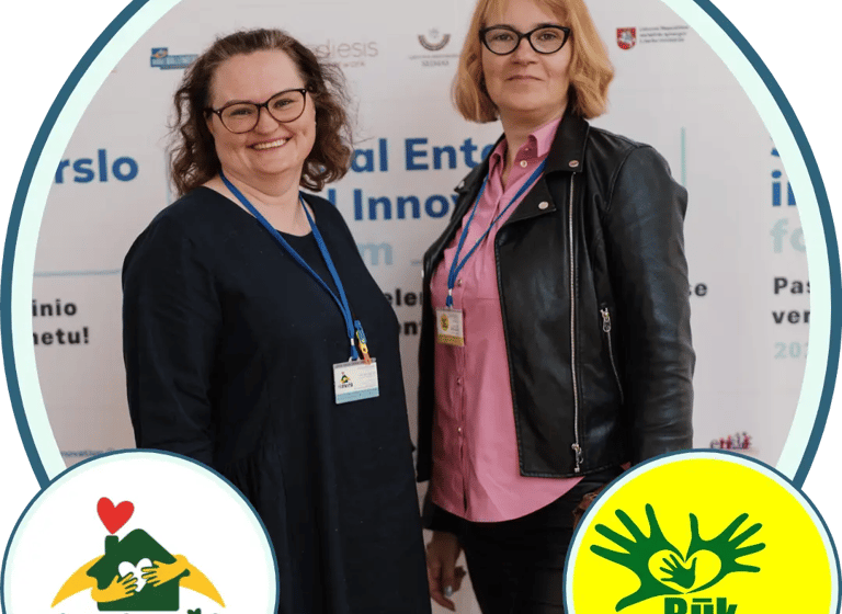 Mes dvi - tai dvi organizacijos - VŠĮ Būk su manimi ir VŠĮ Dirbinyčia, kurios įkūrėme Dirbtuvių namus, kur gimsta nauji gaminiai iš antrinių žaliavų. Mūsų vizija – gamta be tekstilinių atliekų. Vystydamos socialinį verslą, stengiamės, kad kuo mažiau tekstilės gaminių (drabužių, batų, odinės galanterijos, namų tekstilės, aksesuarų) patektų į bendruosius konteinerius. Mes abi vienijame 25 įvairaus amžiaus bendraminčius-savanorius, kurie padeda mums grįžti atgal prie mūsų senelių ir prosenelių šaknų, kai kiekvienas turimas daiktas netinkamas naudojimui, pritaikomas kasdienybėje kitu pavidalu (prijuoste, pirkinių maišeliu, dovanų maišeliu, pašluoste, kilimėliu ir t.t.)