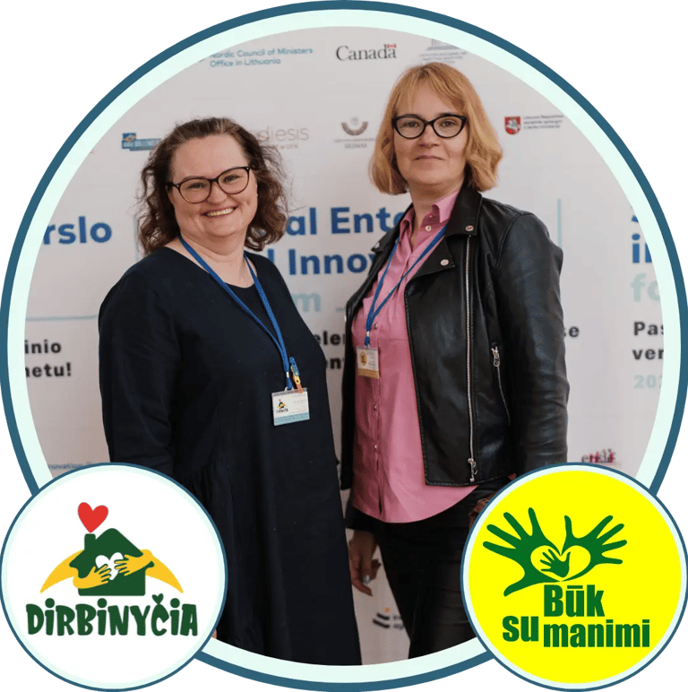 Esam dvi nenuoramos merginos: Almantė ir Jolita, kurioms norisi ne tik kurti kartu, bet kartu padėti tiems, kurie atsiduria krizinėse gyvenimo situacijose. Mes turime savo profesinį bagažą: Almatė - anglų kalbos, pradinio ugdymo ir darbų mokytoja, Jolita turi medicininį išsilavinimą ir praktinės darbinės patirties socialinės pedagogikos srityje. Darbinė praktika mus išmokė skaityti įstatymus, juose susigaudyti. Gyvenimas išmokė pasiūlyti savo pagalbą, būti empatiškomis ir atkakliomis.