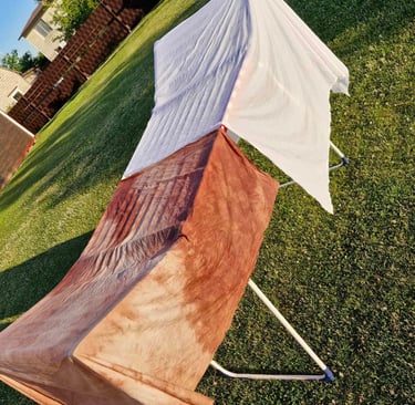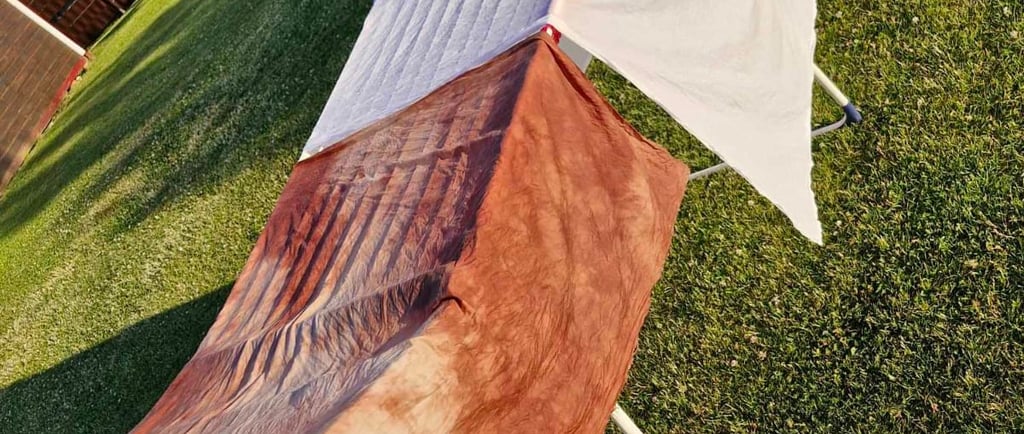 Visas procesas užima ne menkai laiko: vieno dažymo metu, mums pavyksta nudažyti maximum 2 didžiąsias senovines staltieses arba 3 dvigulei lovai skirtas paklodes. Pats dažymo procesas užtrunka 2 dienas, o kur dar audinio skalbimas prieš dažymą, mirkymas po dažymo, skalbimas ir skalavimas po dažymo, džiovinimas gryname ore. Visa tai užima laiko ir supranti, kad jei nori pasiekti savo įsivaizduojamą rezultatą, vienas pilnas dažymo seansas užtrunka apie 4-5 dienas. Tad sėdėti prie išmaniųjų technologijų ir pildyti elektroninės parduotuvės dienoraštį, laiko neužteko.