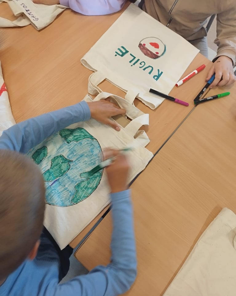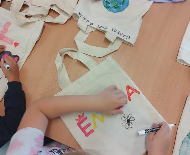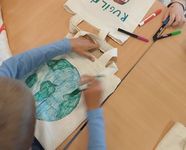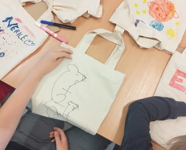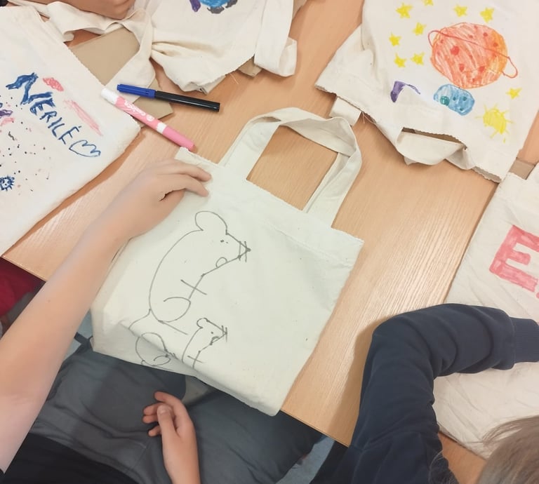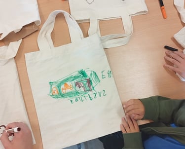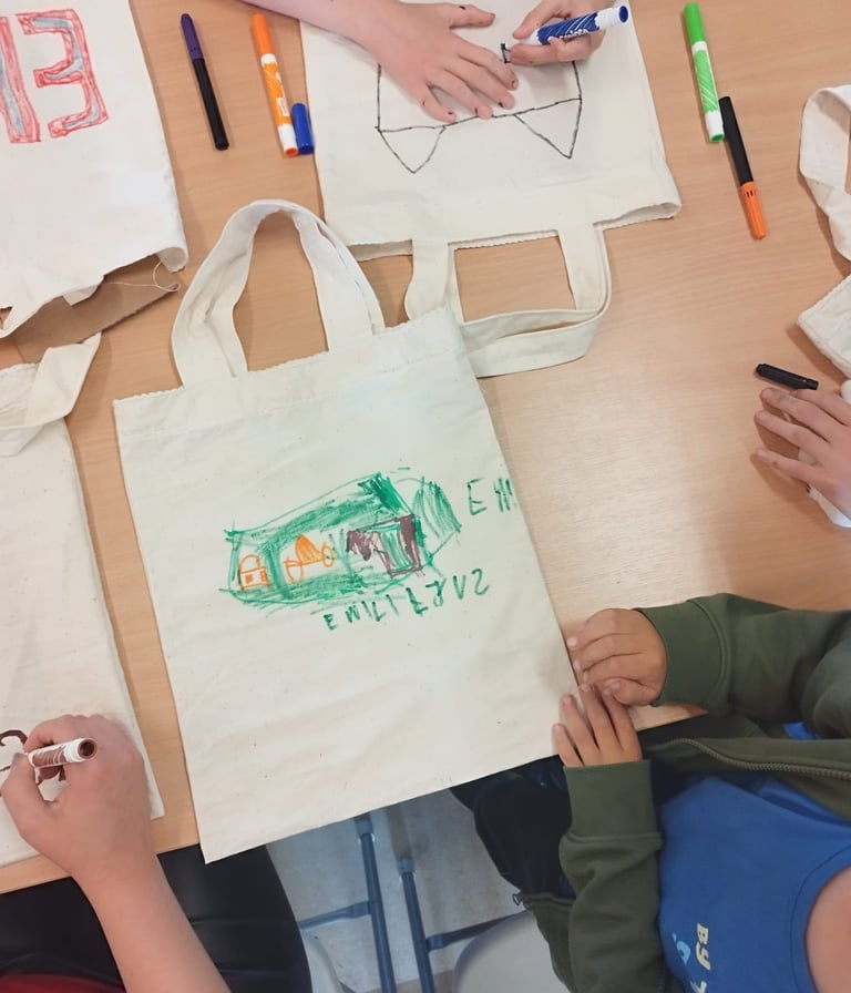Pokalbius su vaikais dažnai užbaigiame kažkokiu praktiniu darbu, kuris kiekvienam vaikui suteikia galimybę išlaisvinti vaizduotę. Šį kartą, vaikai turėjo galimybę iliustruoti maišelį, kuris po piešimo ir termo apdorojimo atiteko mažajam iliustratoriui,